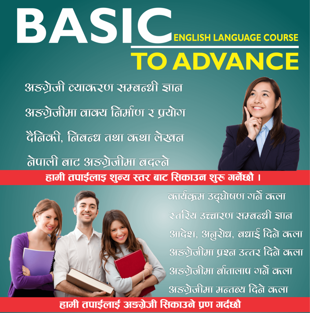 तपाईलाई अंग्रेजी के आउँछ? कति आउँछ? हामी कहिले सोध्ने छैनौं हामी तपाईंलाई सुरुबाट (सुन्य स्तर) बाट अध्यापन गराई अंग्रेजीमा पोख्त बनाउने संकल्पका साथ अतिनै मेहनत गरी विद्यार्थीहरुका स-साना कुराहरुमा पनि ध्यान दिई भाषा विज्ञहरुबाट यो कोर्ष तयार गरेका छौं। आउनुहोस् आजैबाट अङ्ग्रेजी सिक्ने गन्तव्यमा अगाडी बढ्नुहोस।